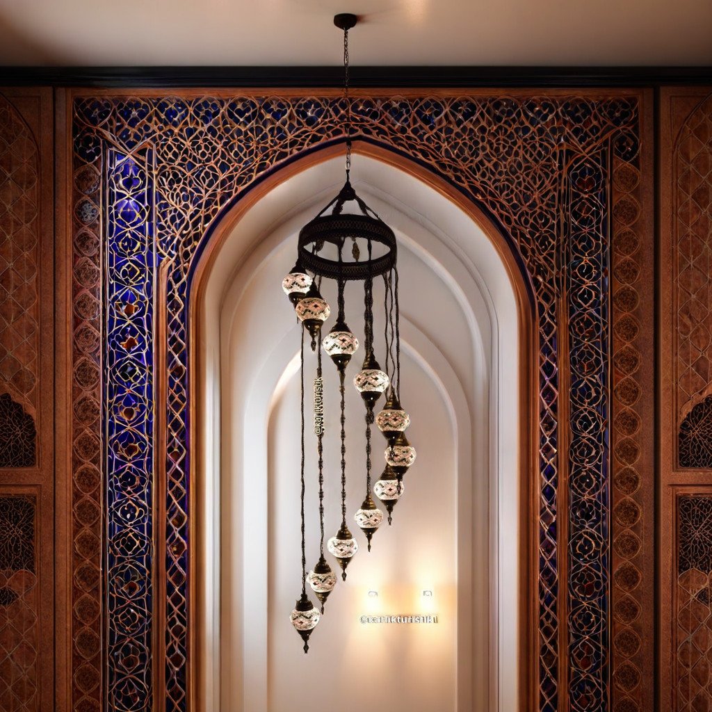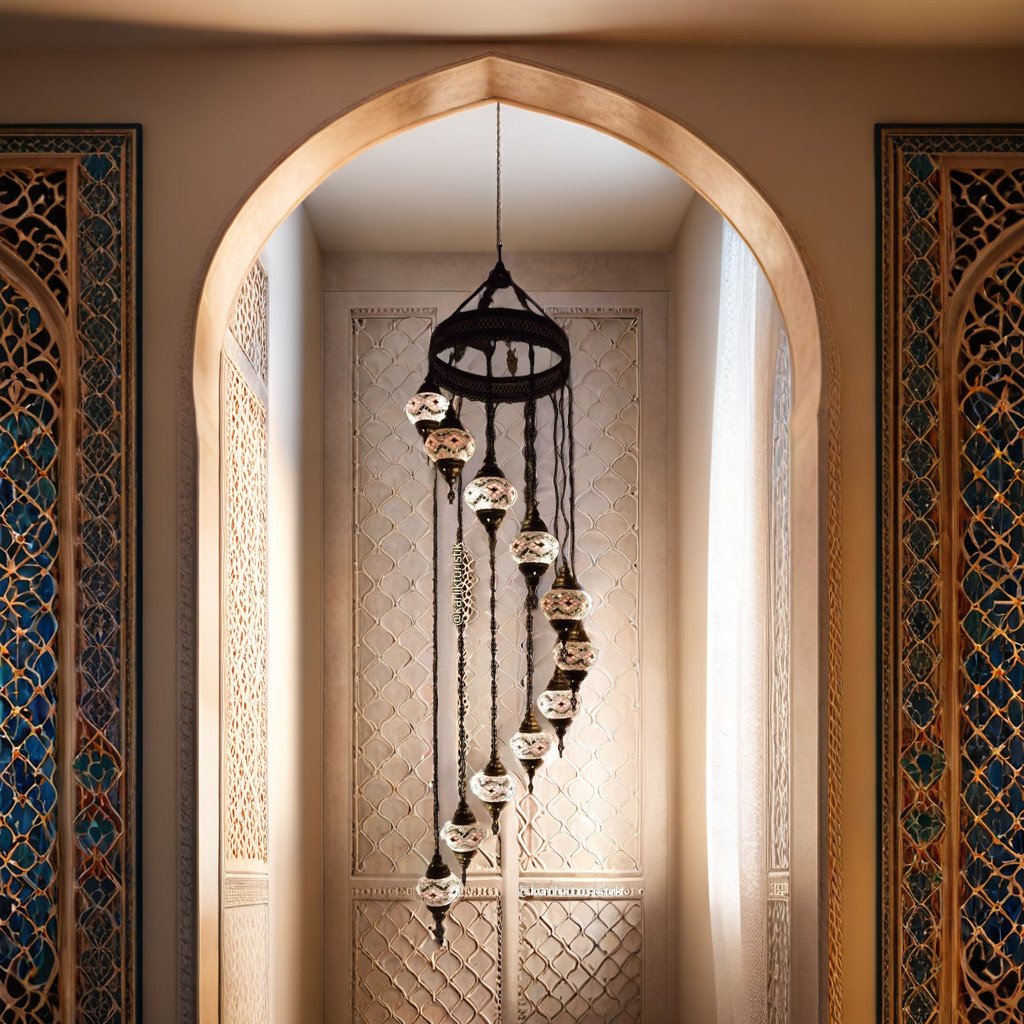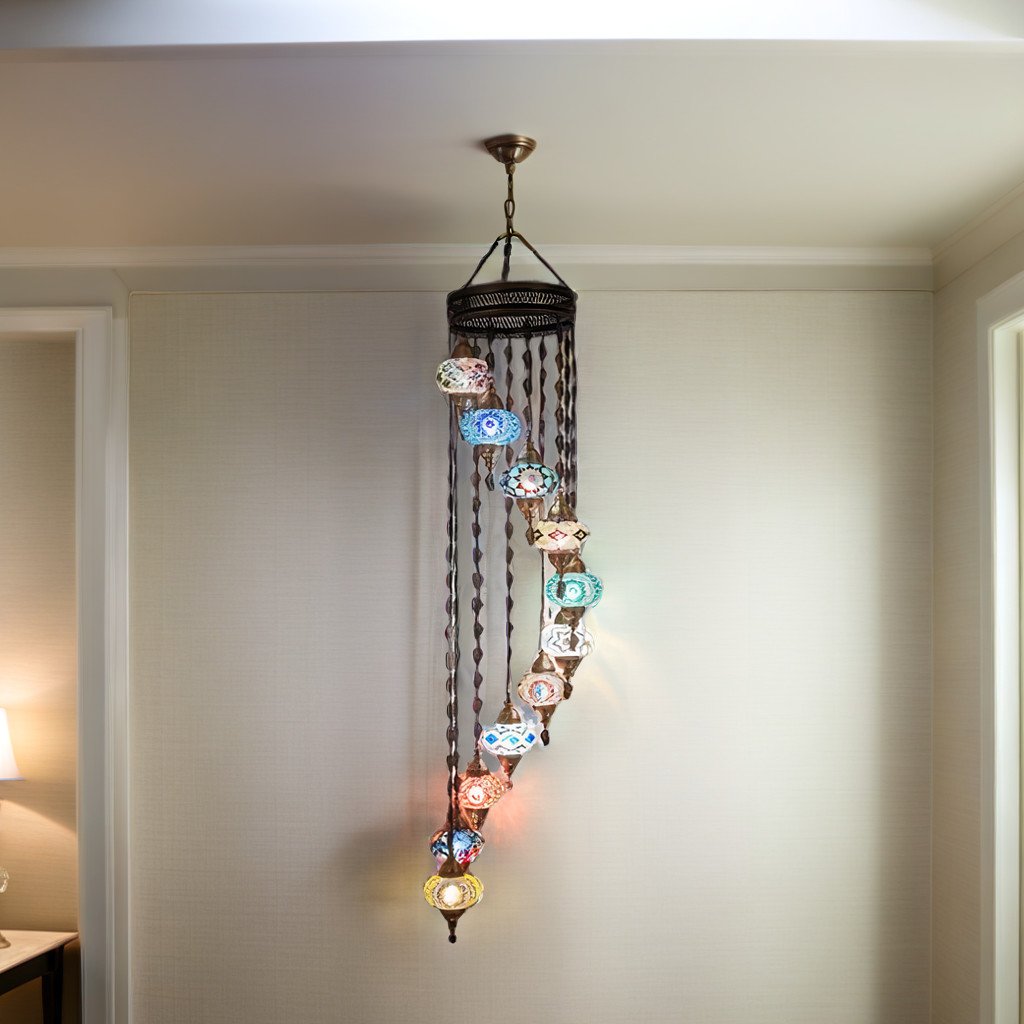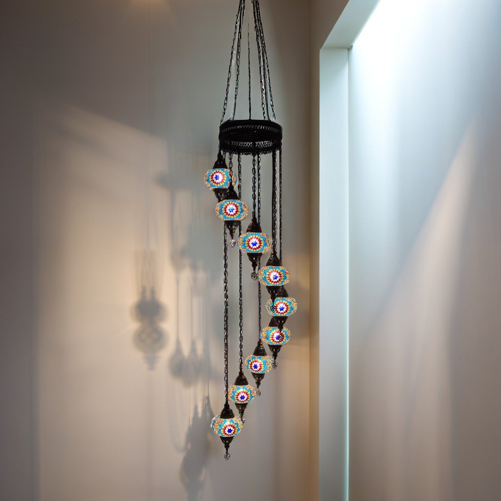 Beautify your entryway stairwell or any living space that has a high 15-20′ ceiling with this stunningly elegant 11 Globe Spiral mosaic Chandelier. These chandeliers have been handcrafted by skillful Turkish artisans and are 96″ long and 20″ wide. Stunning patterns are created with hand-cut mosaic glass and beads on the globes. You can customize them according to your preference by choosing all identical globes or create a unique look by mixing and matching the globes to create your own combination. All chandeliers require E12 base chandelier bulbs (Not inclusive, however, you have the option of adding 11 x 4 watt, 2700K, E12 base LED chandelier bulbs to your quote). Chandeliers are 110 V and are suitable for use in Canada and USA. They could be hung from a hook in the ceiling and have a long wire with an on/off switch. However, you could also hardwire them into the ceiling( Mounting hardware not included).