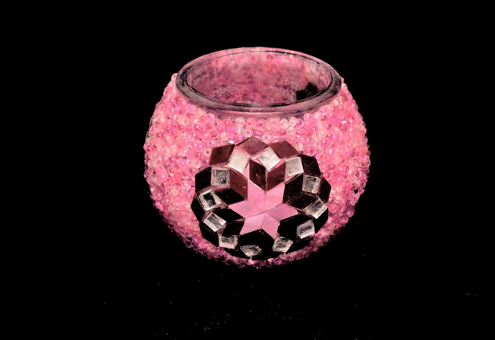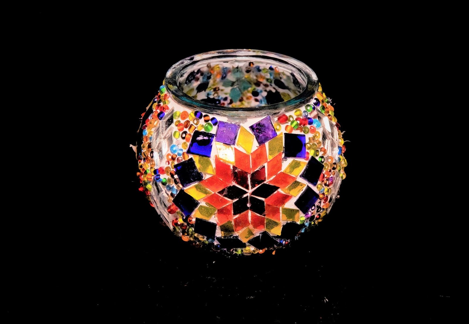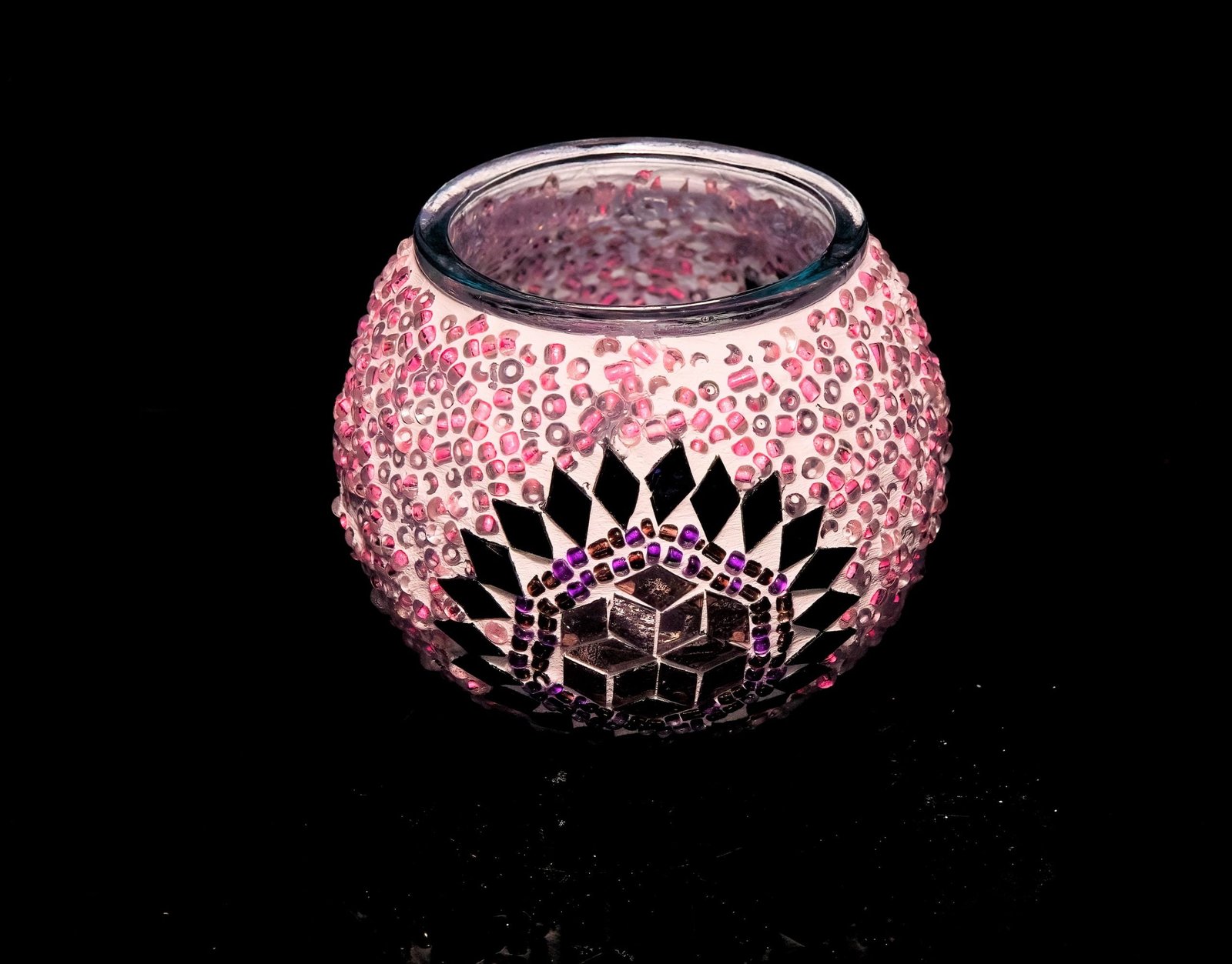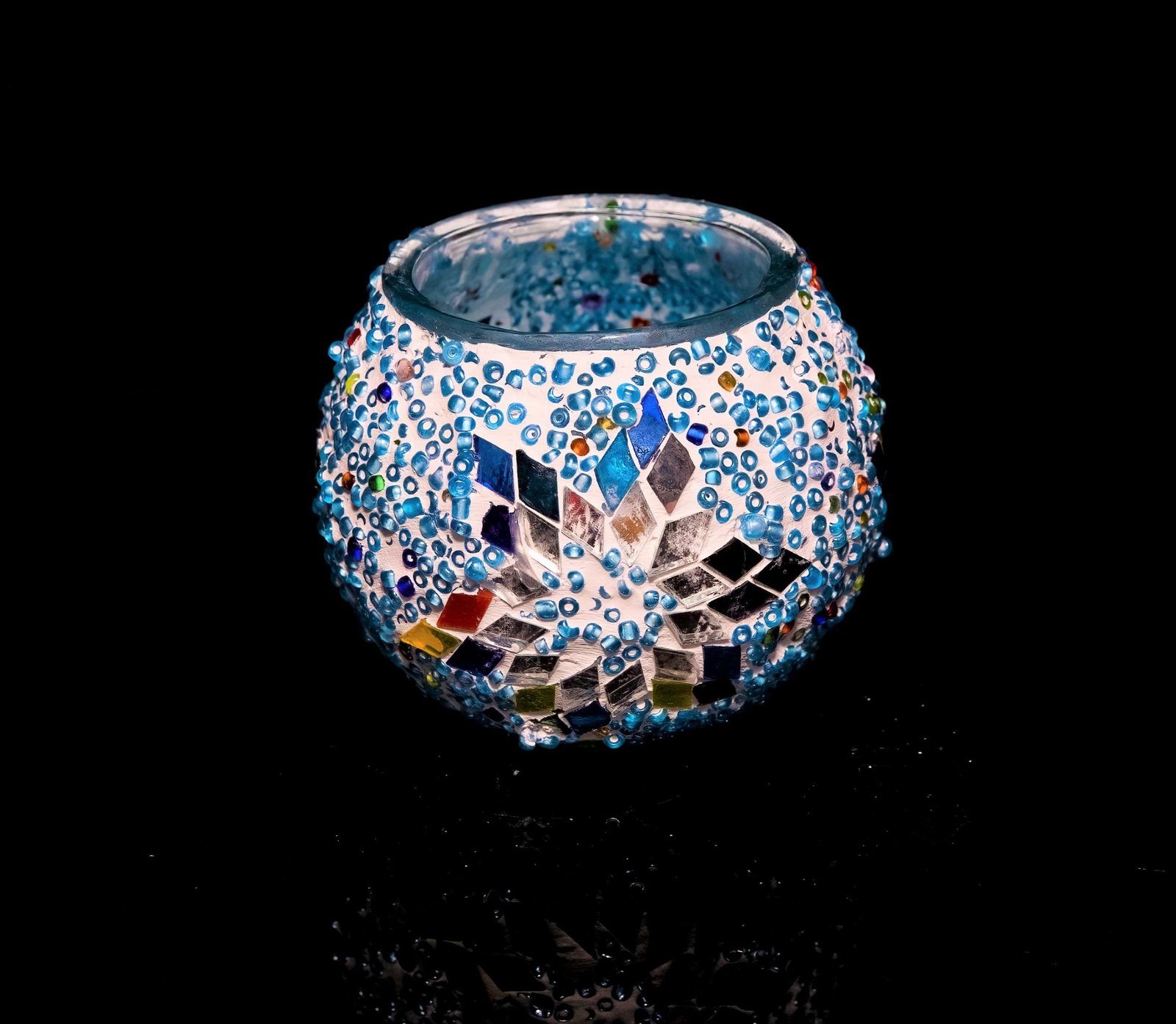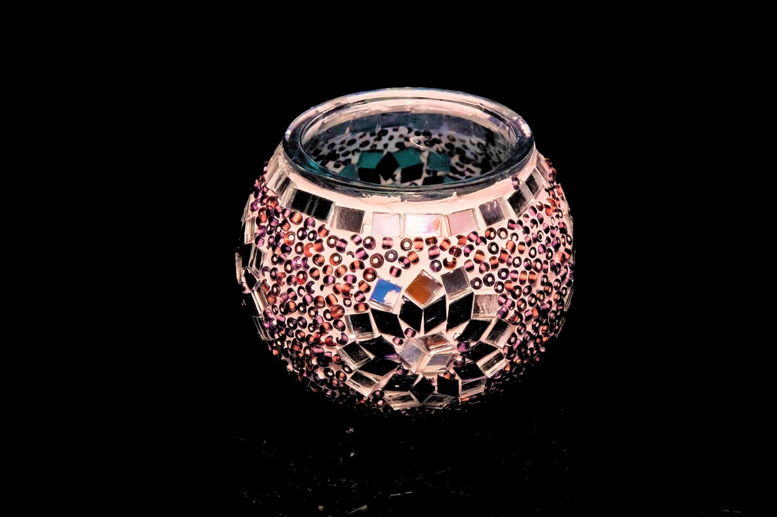 These Turkish mosaic candle holders and handcrafted by skillful Turkish artisans. Hand-cut pieces of glass, mirrors, and beads are put together on handblown glass candle votives. These beautiful pieces of art are very attractive and are available in many designs and bright colors. Create a romantic ambiance by adding a splash of color to your dinner or coffee table. Create a