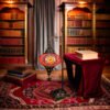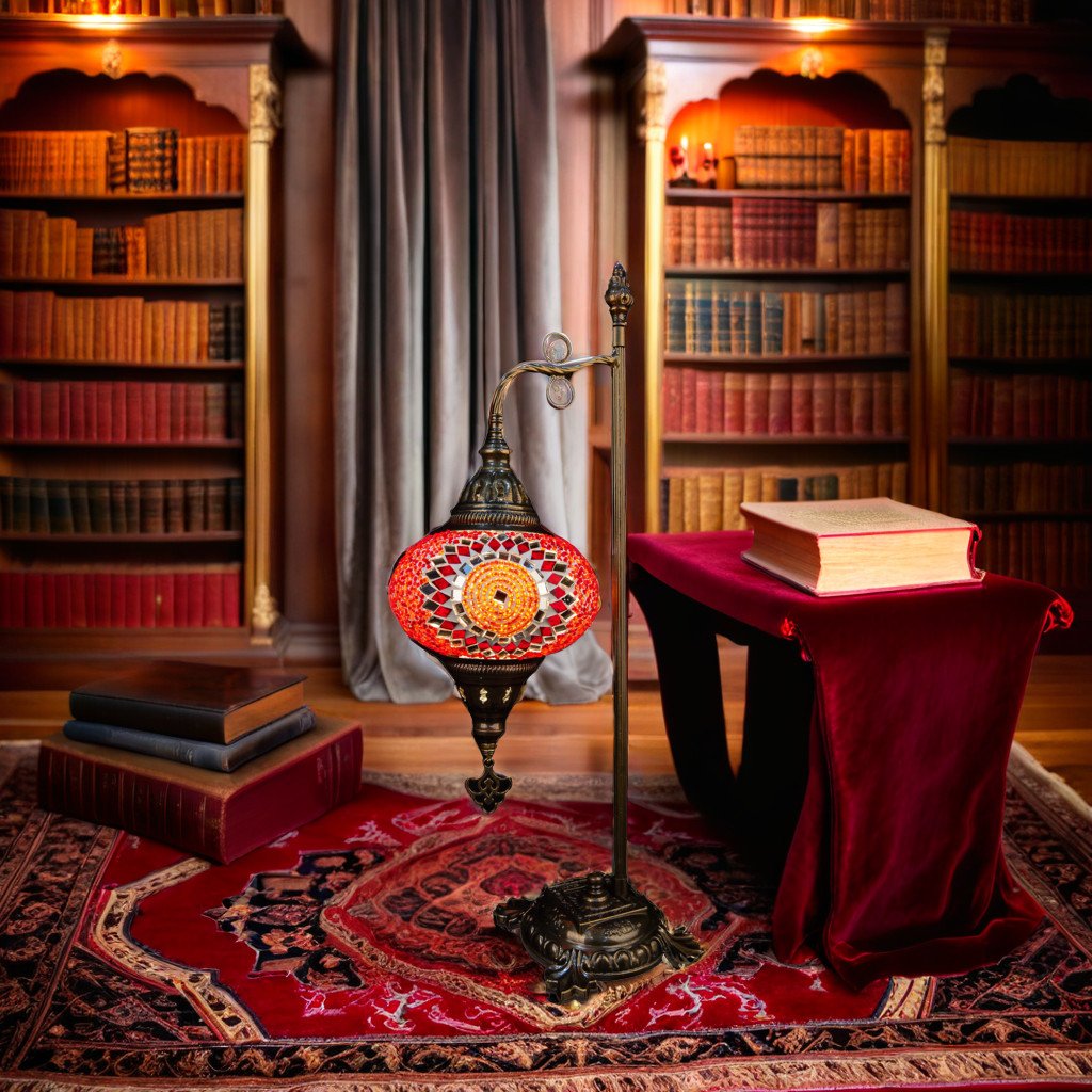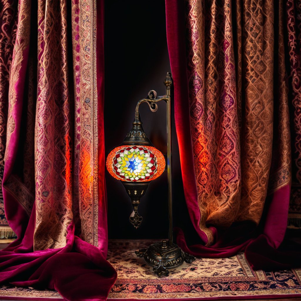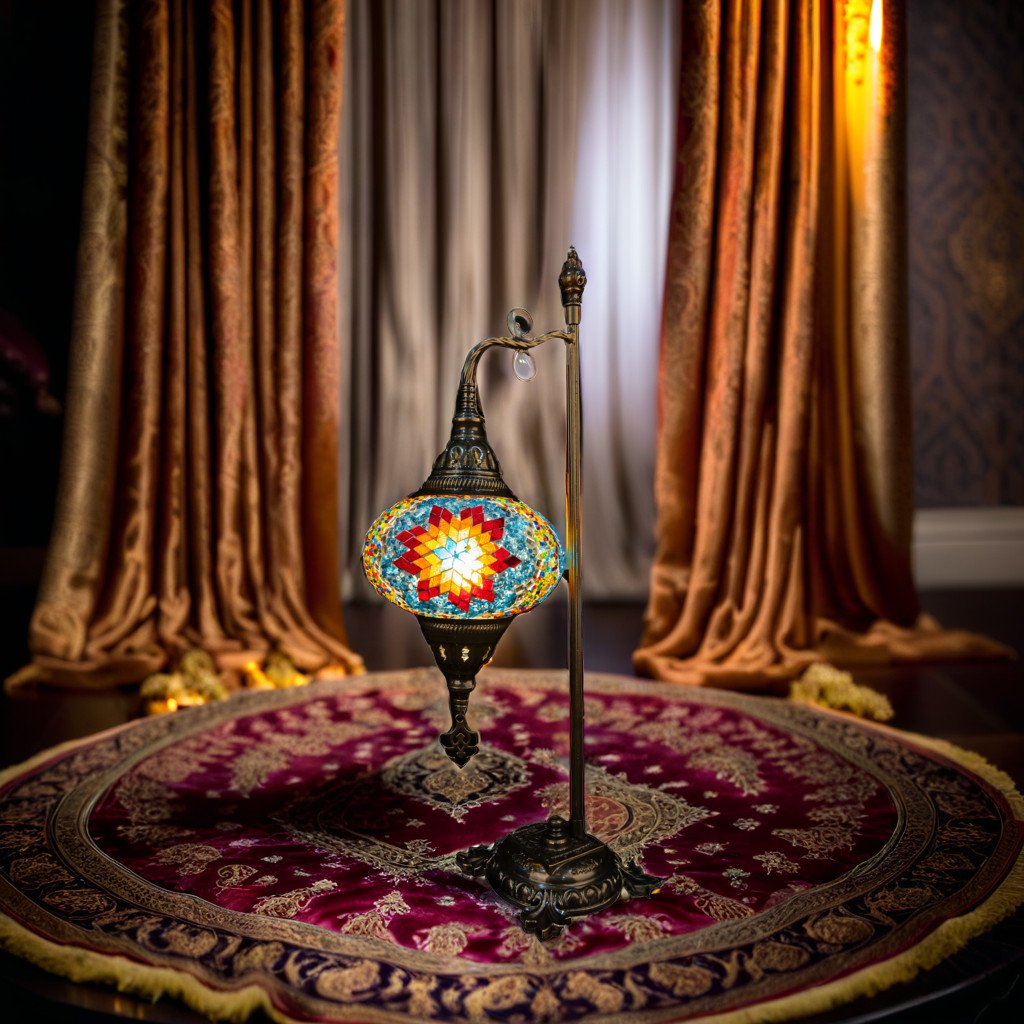 This variation of the traditional Brass base Turkish Swan lamp is inspired by the design of the original street light and adds interest to the décor. The globe does not dangle as in the traditional Swan lamps. They are made with hand cut pieces of high-quality glass and beads which are carefully placed together to produce stunning lamp patterns on a blown glass lamp shade. The vibrant color combinations are simply magical and perfect for home or office décor, gifting for weddings, anniversaries, housewarming parties, Mother’s Day and as festive and corporate gifts. These Lamp Post style lamps are hand made by experienced Turkish artisans. They create a warm romantic ambiance and add charm and splendor to any room in your home or office. They are 110V and suitable for use in USA and Canada. These lamps are ready to plug in and have an on/off switch. They have an E12 socket and requires 1 LED bulb. (Not included, however, you have the option of adding 1 x 4 watt, 2700K, E12 base LED chandelier bulb to your quote).