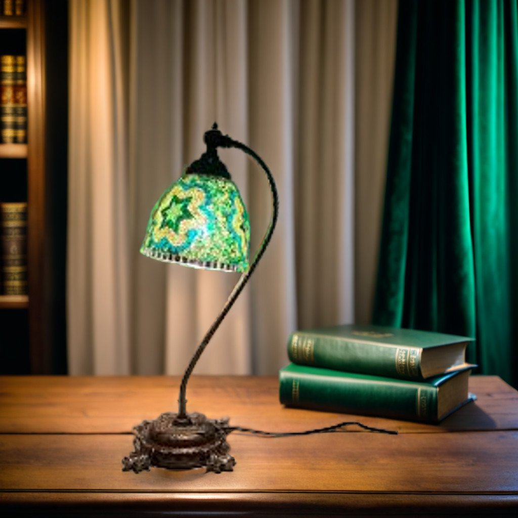 These Reading Lamps are made by skillful Turkish artisans, using hand cut pieces of high-quality glass and beads which are carefully placed together to produce stunning lamp patterns on a blown glass lamp shade. The vibrant color combinations are simply magical and perfect for home or office décor, gifting for weddings, anniversaries, house-warming parties, Mother’s Day and as festive and corporate gifts. They create a warm romantic ambiance and add charm and splendor to your bedside tables in your home or on any desk in your office or library. They are 110V and suitable for use in USA and Canada. These lamps are ready to plug in and have an on/off switch. The metal base has a knob that helps you adjust the angle of the glass shade for perfect reading light. They have an E12 socket and requires 1 LED bulb. (Not included, however, you have the option of adding 1 x 4 watt, 2700K, E12 base LED chandelier bulb to your quote).