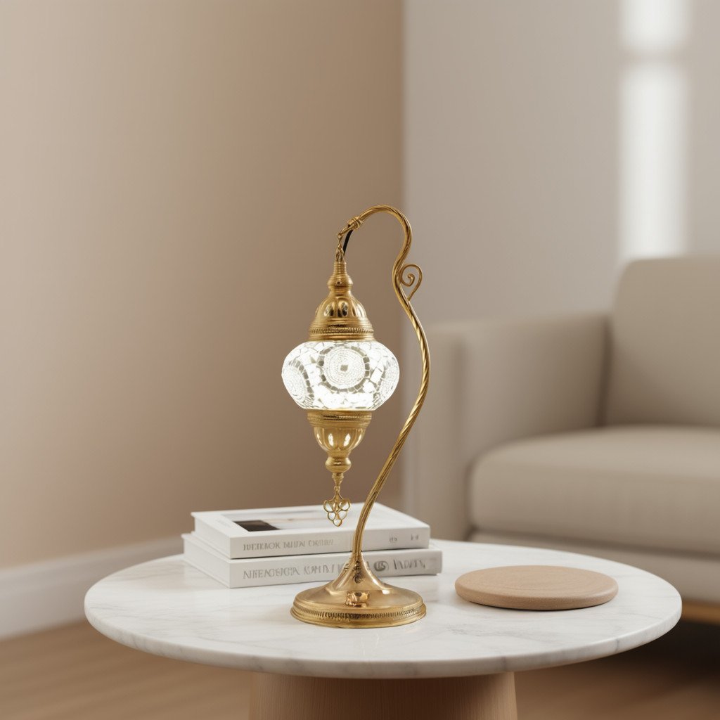 This variation of the traditional Brass base Turkish Swan lamp has a Golden base to add a hint of richness to the décor. They are made with hand cut pieces of high-quality glass and beads which are carefully placed together to produce stunning lamp patterns on a blown glass lamp shade. The vibrant color combinations are simply magical and perfect for home or office décor, gifting for weddings, anniversaries, housewarming parties, Mother’s Day and as festive and corporate gifts. The Gold base Swan lamps are hand made by experienced Turkish artisans. They create a warm romantic ambiance and add charm and splendor to any room in your home or office. They are 110V and suitable for use in USA and Canada. These lamps are ready to plug in and have an on/off switch. They have an E12 socket and requires 1 LED bulb. (Not included however, you have the option of adding 1 x 4 watt, 2700K, E12 base LED chandelier bulb to your quote).