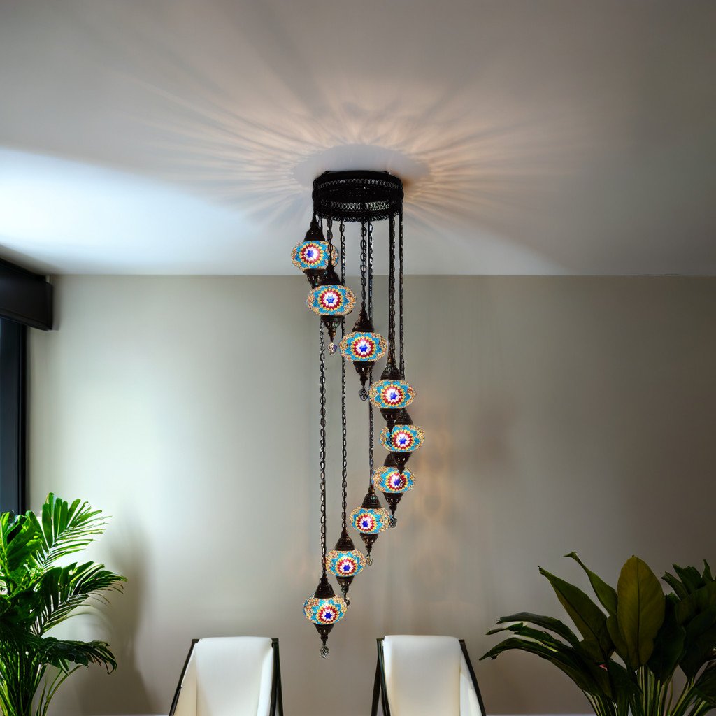 Beautify your entryway stairwell or any living space that has a high 15-20′ ceiling  with this stunningly elegant 11 Globe Spiral mosaic Chandelier. These chandeliers have been handcrafted by skillful Turkish artisans and are 96″ long and 20″ wide. Stunning patterns are created with hand-cut mosaic glass and beads on the globes. You can customize them according to your preference by choosing all identical globes or create a unique look by mixing and matching the globes to create your own combination. All chandeliers require E12 base chandelier bulbs (Not inclusive, however, you have the option of adding 11 x 4 watt, 2700K, E12 base LED chandelier bulbs to your quote). Chandeliers are 110 V and are suitable for use in Canada and USA. They could be hung from a hook in the ceiling and have a long wire with an on/off switch. However, you could also hardwire them into the ceiling( Mounting hardware not included).