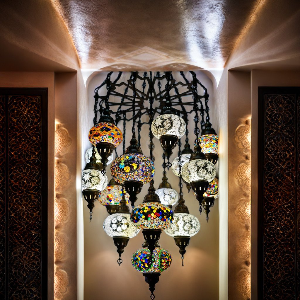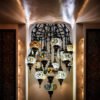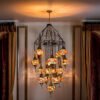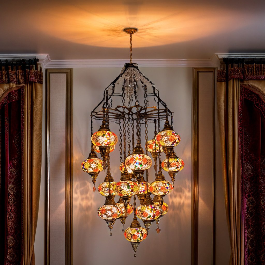 Beautify your entryway stairwell or any living space that has a high 15-20′ ceiling with this absolutely gorgeous, stunningly elegant 17 Globe Clustered mosaic Chandelier. These chandeliers have been handcrafted by skillful Turkish artisans and are 60″ long and 24 x 24″ wide. Exotic patterns are created with hand-cut mosaic glass and beads that are glued onto the globes. You can customize them according to your preference by choosing all identical globes or create a unique look by mixing and matching the globes to create your own combination. All chandeliers require E12 base chandelier bulbs (Not inclusive, however, you have the option of adding 17 x 4 watt, 2700K, E12 base LED chandelier bulbs to your quote). Chandeliers are 110V and are suitable for use in Canada and USA. They could be hung from a hook in the ceiling and have a long wire with an on/off switch. Alternatively, you could also hardwire them into the ceiling( however, mounting hardware is not included)