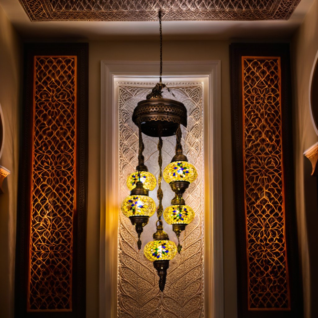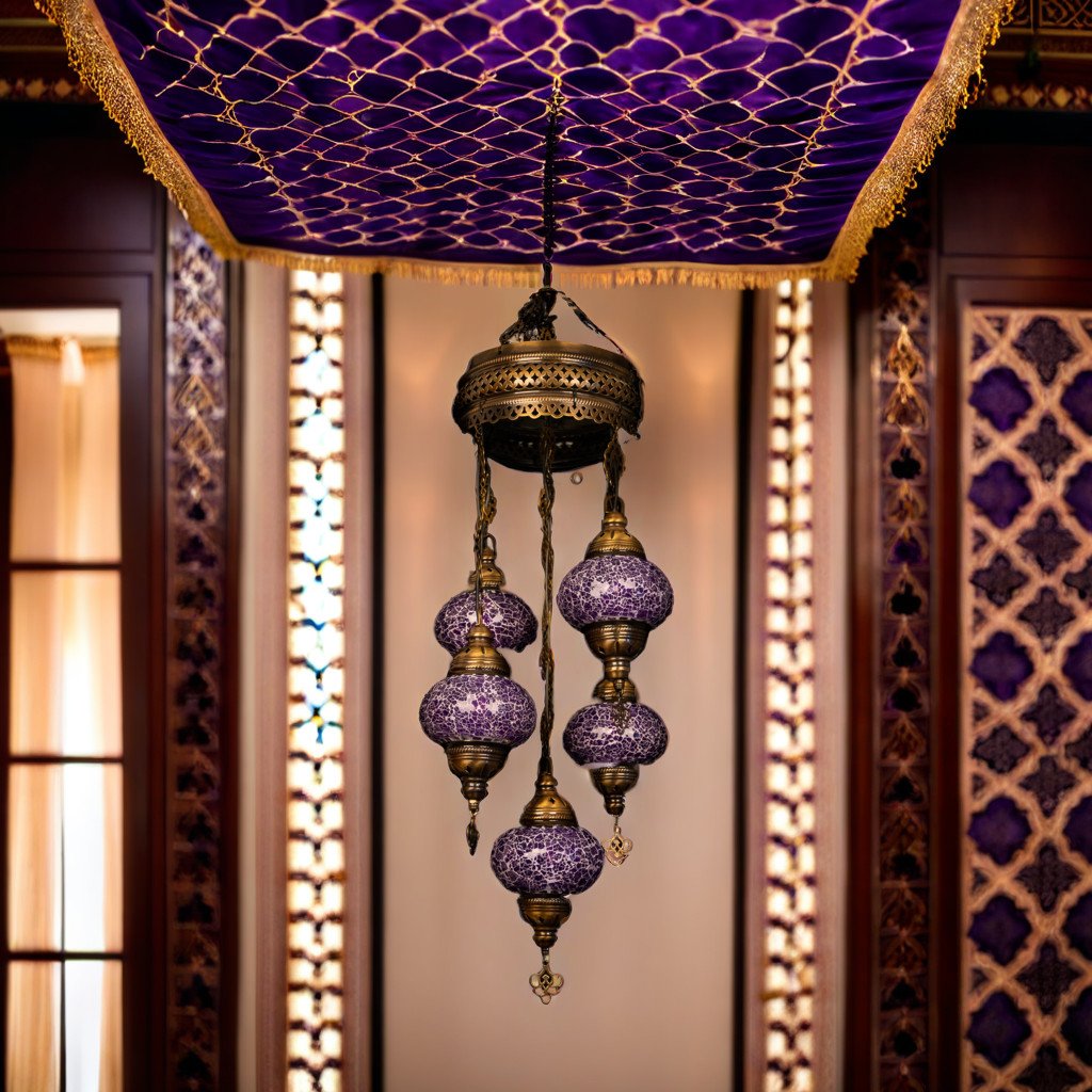 This elegant 5 Globe Chandelier (10″ Globes) has been handcrafted by skillful Turkish artisans. Stunning patterns are created with hand-cut mosaic glass and beads on the globes. Being handcrafted, the beauty in design lies in the minor differences while patterning the globes. You can customize these chandeliers according to your preference by choosing all identical globes or create a unique look by mixing and matching the globes to create your own combination. All chandeliers require E12 base chandelier bulbs (Not inclusive, however, you have the option of adding 5 x 4 watt, 2700K, E12 base LED chandelier bulbs to your quote). These Chandeliers are 110 V and are suitable for use in Canada and USA. The are inclusive of an on-off switch and can be plugged into a wall socket. Alternatively, they can also be hardwired into the ceiling. (Mounting hardware is not included).