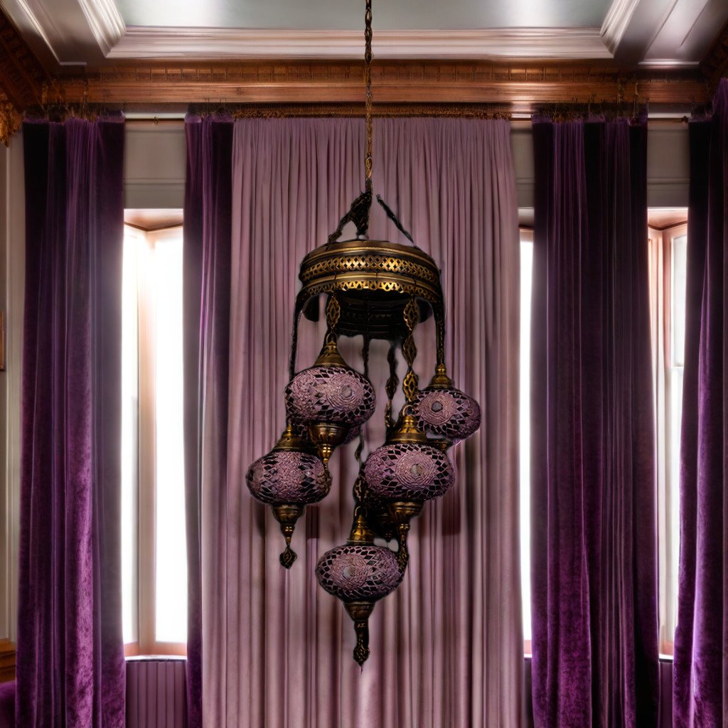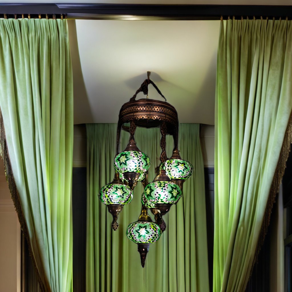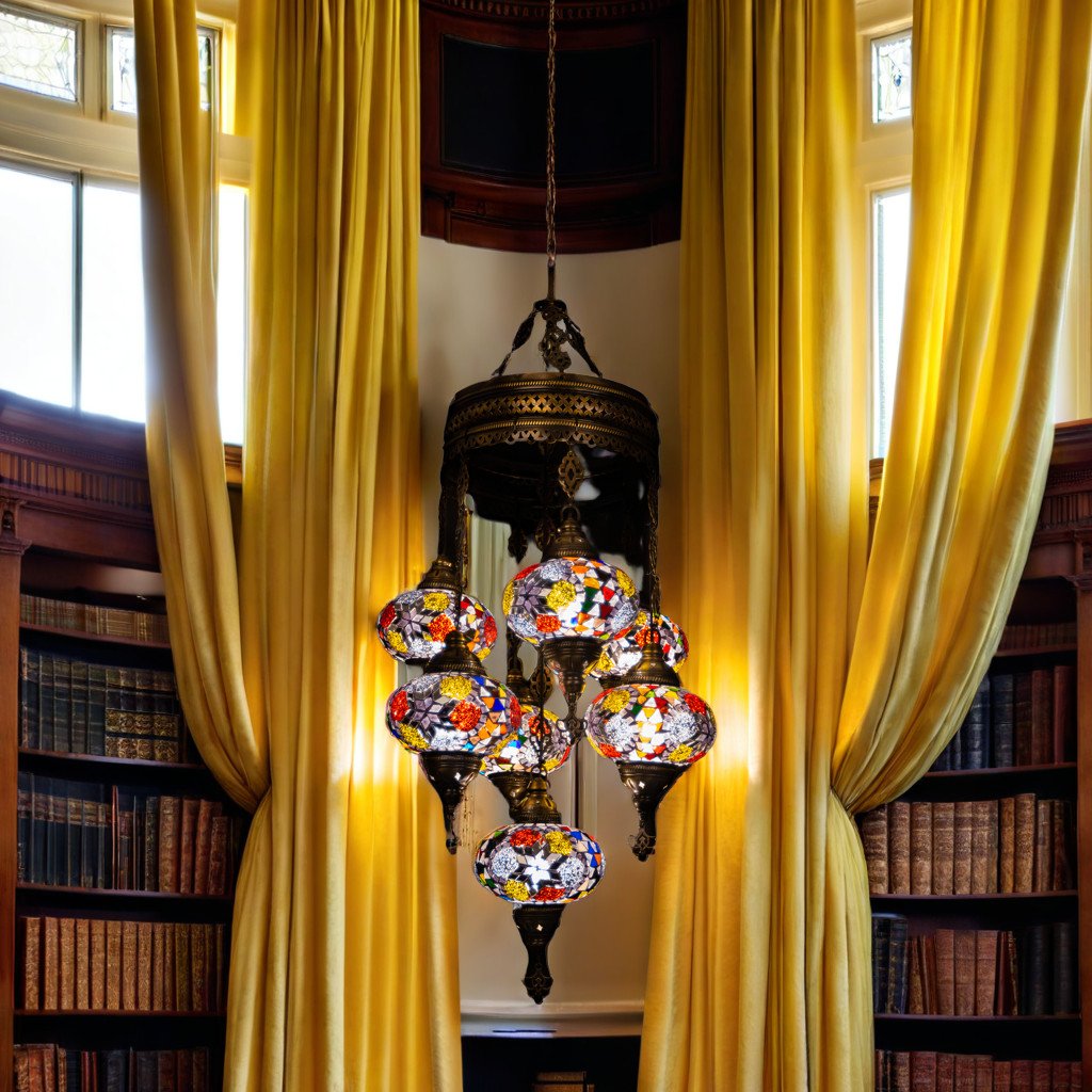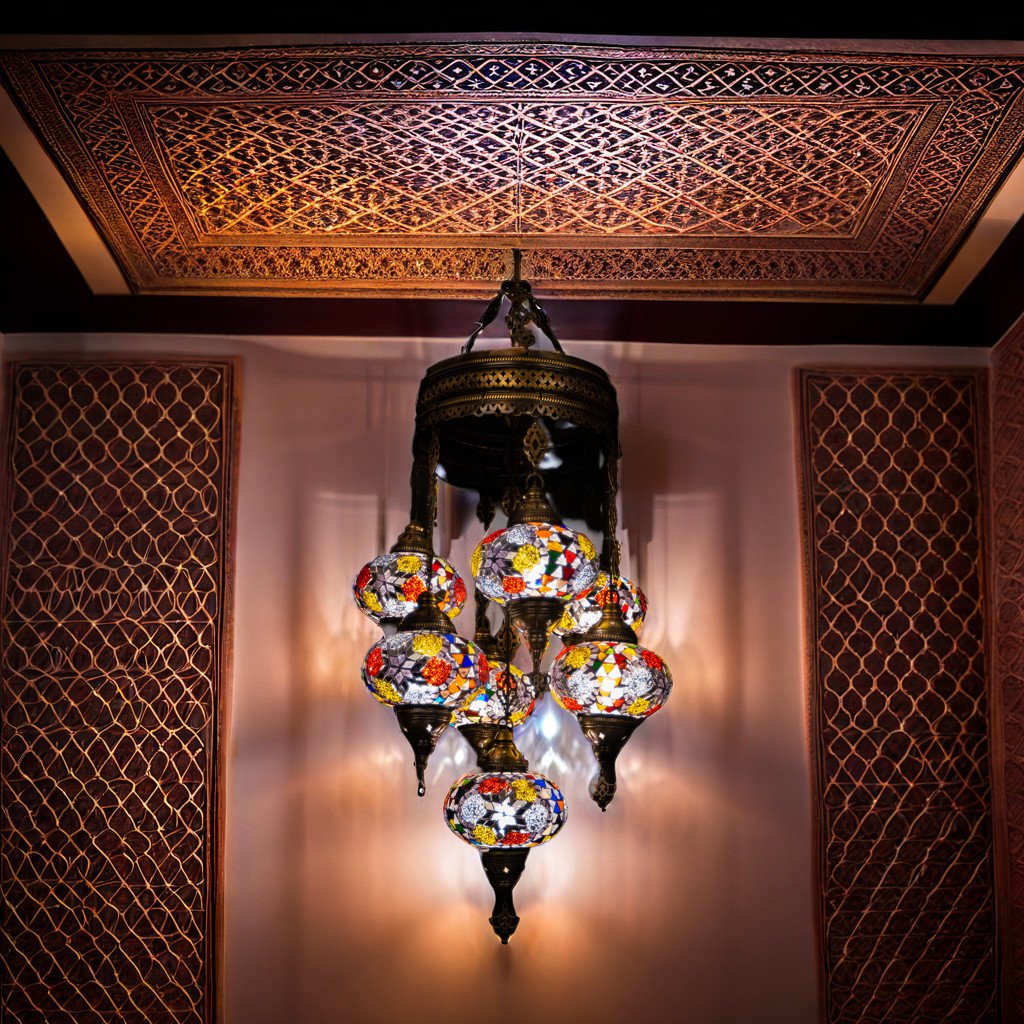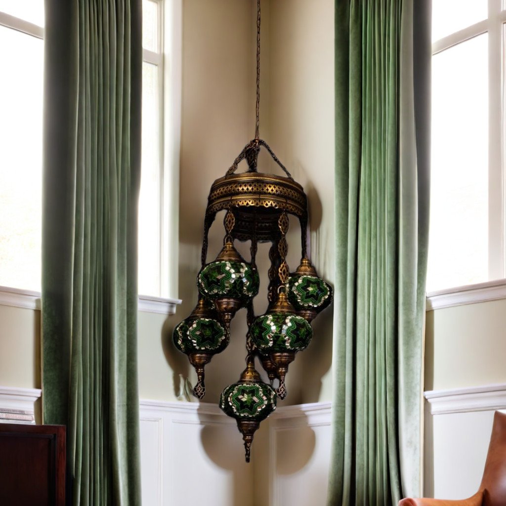 This elegant 7 Globe Chandelier (10″ Globes) has been handcrafted by skillful Turkish artisans. Stunning patterns are created with hand-cut mosaic glass and beads on the globes. Being handcrafted, the beauty in design lies in the minor differences while patterning the globes. You can customize these chandeliers according to your preference by choosing all identical globes or create a unique look by mixing and matching the globes to create your own combination. All chandeliers require E12 base chandelier bulbs (Not inclusive, however, you have the option of adding 7 x 4 watt, 2700K, E12 base LED chandelier bulbs to your quote). These Chandeliers are 110 V and are suitable for use in Canada and USA. The are inclusive of an on-off switch and can be plugged into a wall socket. Alternatively, they can also be hardwired into the ceiling.(Mounting hardware is not included).
