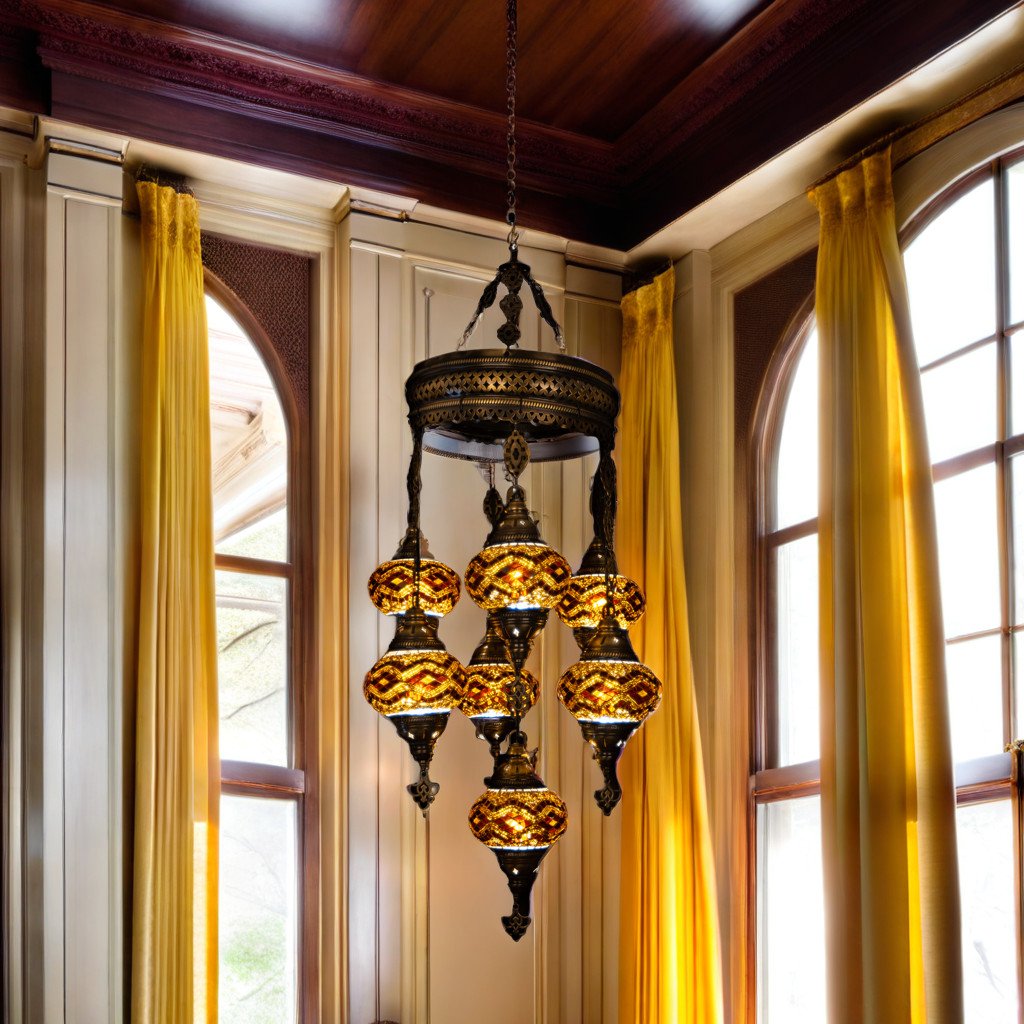 This elegant 7 Globe Chandelier (6″ Globes) has been handcrafted by skillful Turkish artisans. Stunning patterns are created with hand-cut mosaic glass and beads on the globes. Being handcrafted, the beauty in design lies in the minor differences while patterning the globes. You can customize these chandeliers according to your preference by choosing all identical globes or create a unique look by mixing and matching the globes to create your own combination. All chandeliers require E12 base chandelier bulbs (Not inclusive, however, you have the option of adding 7 x 4 watt, 2700K, E12 base LED chandelier bulbs to your quote). These Chandeliers are 110 V and are suitable for use in Canada and USA. The are inclusive of an on-off switch and can be plugged into a wall socket. Alternatively, they can also be hardwired into the ceiling. ( Mounting hardware is not included).