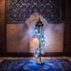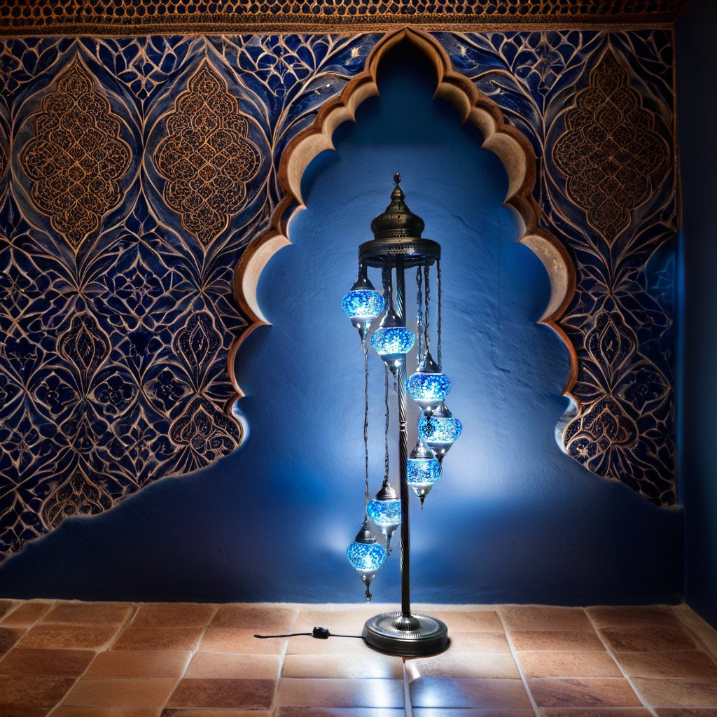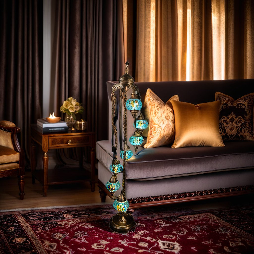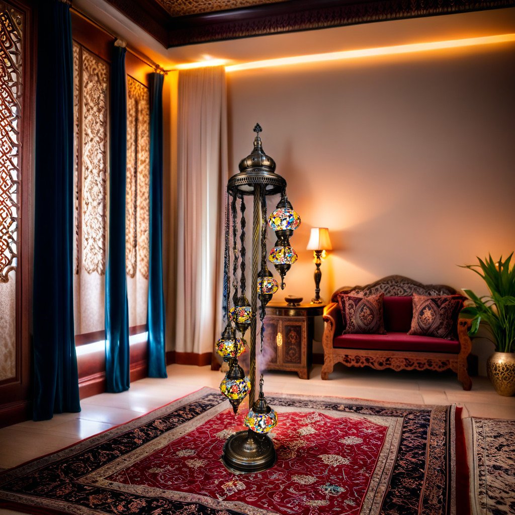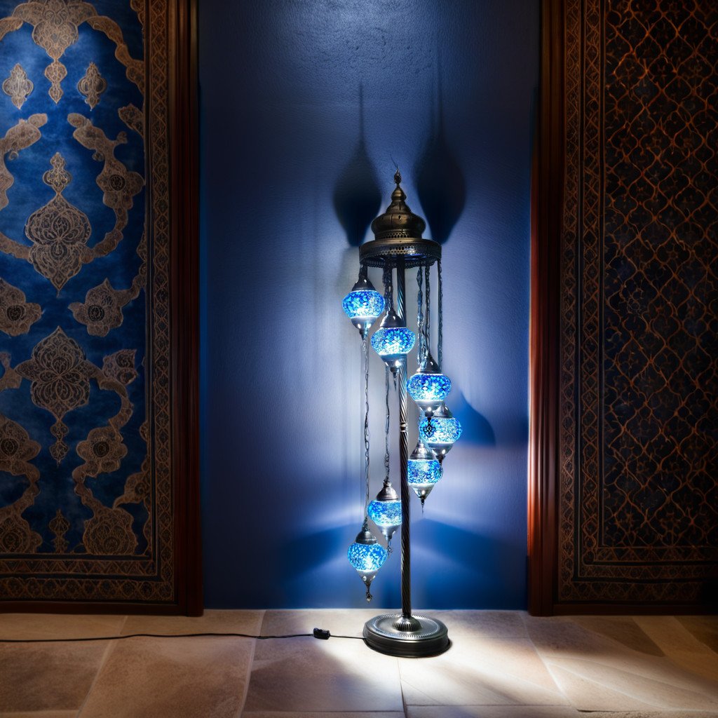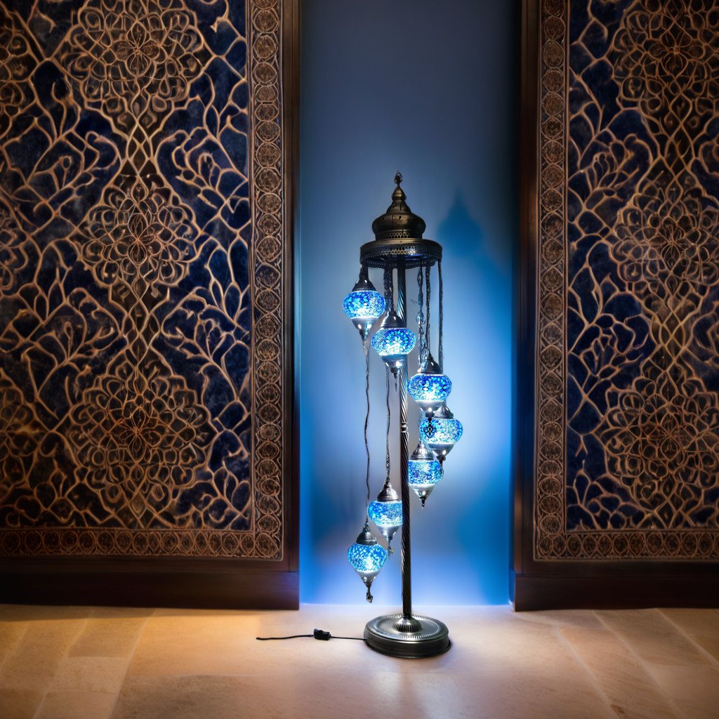 Beautify your entryway or any corner in your home with this elegant 7 Globe Floor Lamp (6″ Globes). These lamps have been handcrafted by skillful Turkish artisans. Stunning patterns are created with hand-cut mosaic glass and beads on the globes. Achieving this level of precision in design requires a great deal of dedication which is clearly visible in the final product. Being handcrafted, the beauty in design lies in the minor differences while patterning the globes. You can customize these chandeliers according to your preference by choosing all identical globes or create a unique look by mixing and matching the globes to create your own combination. All Floor Lamps require E12 base chandelier bulbs (Not inclusive, however, you have the option of adding 7 x 4 watt, 2700K, E12 base LED chandelier bulbs to your quote). These lamps are 110 V and are suitable for use in Canada and USA. They are inclusive of an on-off switch and can be plugged into a wall socket.