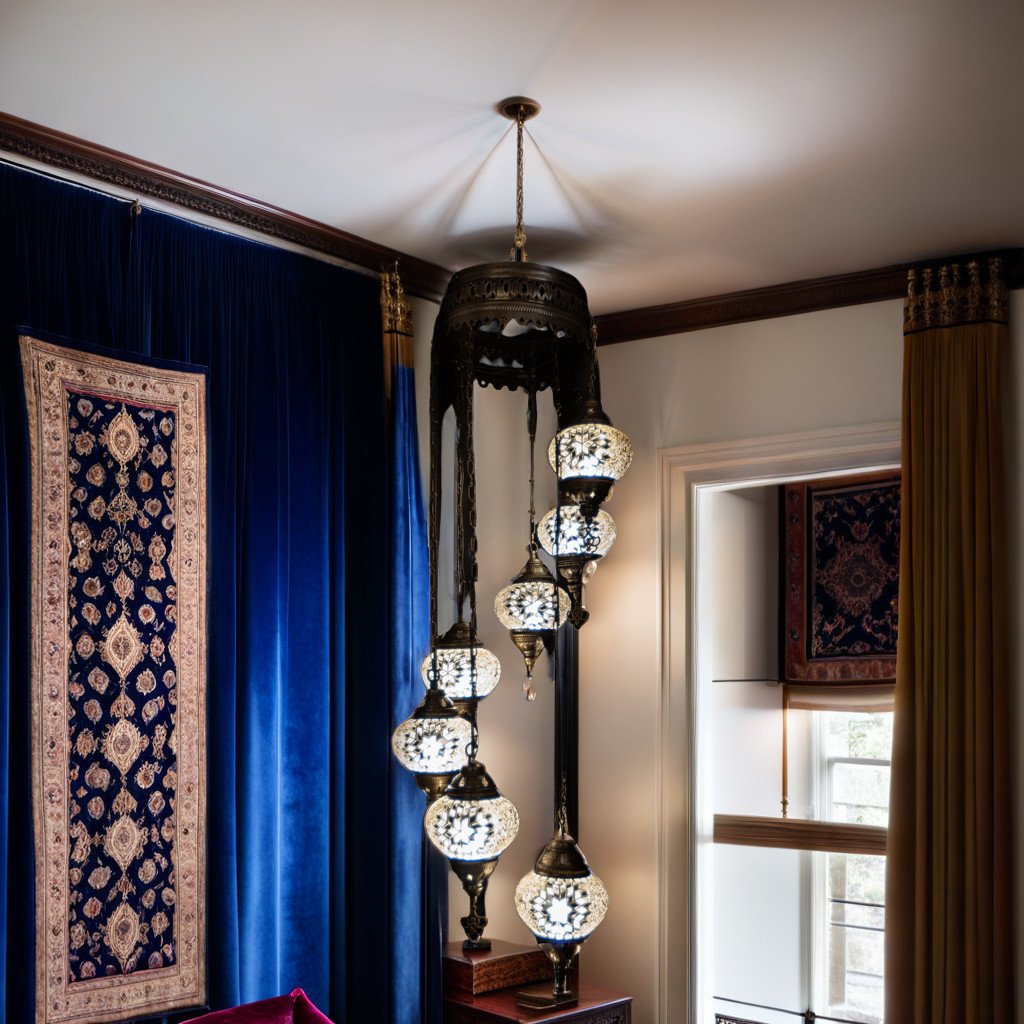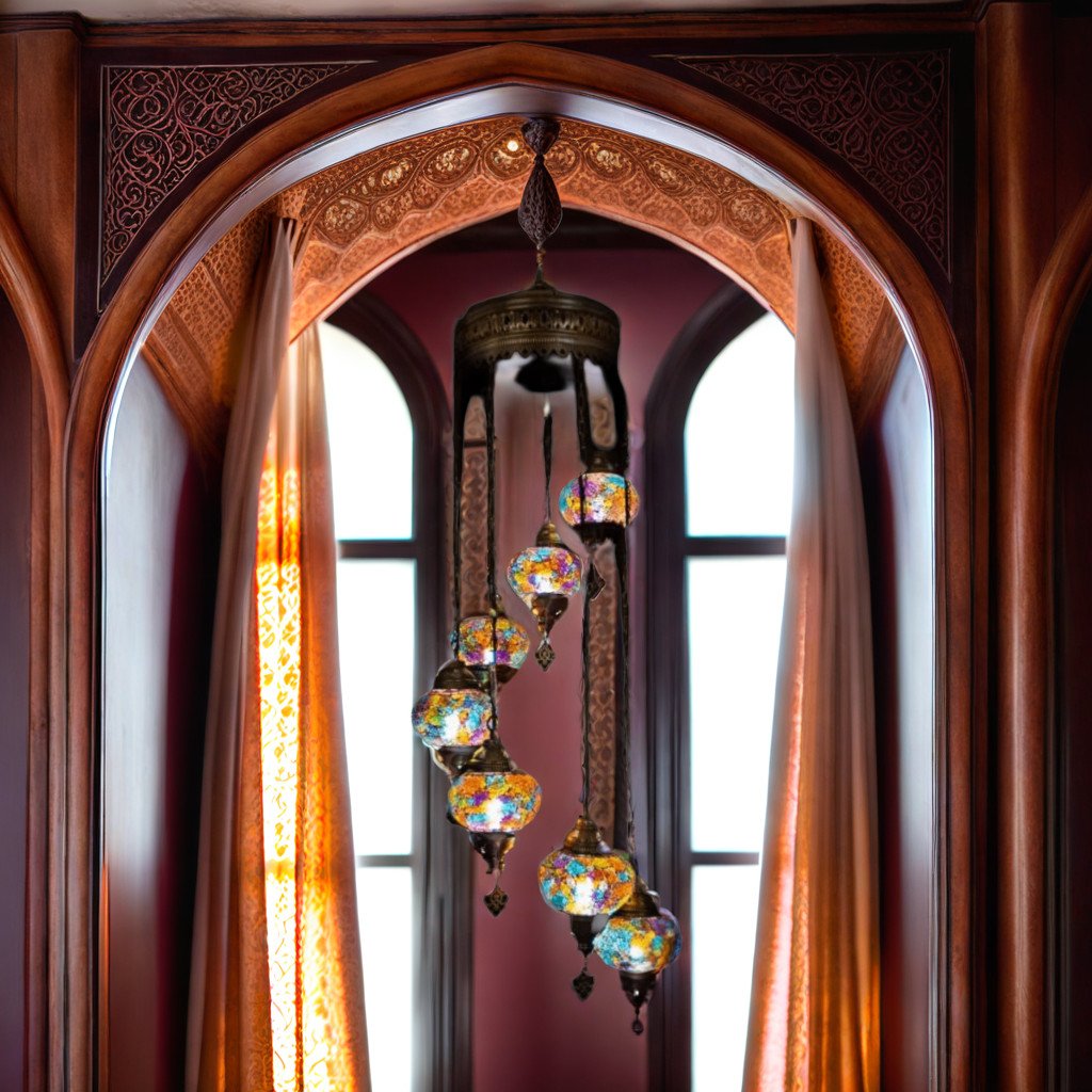 This elegant 7 Globe Chandelier (6″ Globes) has been handcrafted by skillful Turkish artisans. Stunning patterns are created with hand-cut mosaic glass and beads on the globes. Being handcrafted, the beauty in design lies in the minor differences while patterning the globes. You can customize these chandeliers according to your preference by choosing all identical globes or create a unique look by mixing and matching the globes to create your own combination. All chandeliers require E12 base chandelier bulbs (Not inclusive, however, you have the option of adding 7 x 4 watt, 2700K, E12 base LED chandelier bulbs to your quote). These Chandeliers are 110 V and are suitable for use in Canada and USA. The are inclusive of an on-off switch and can be plugged into a wall socket. Alternatively, they can also be hardwired into the ceiling. (Mounting hardware is not included)