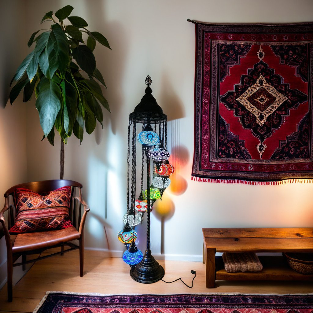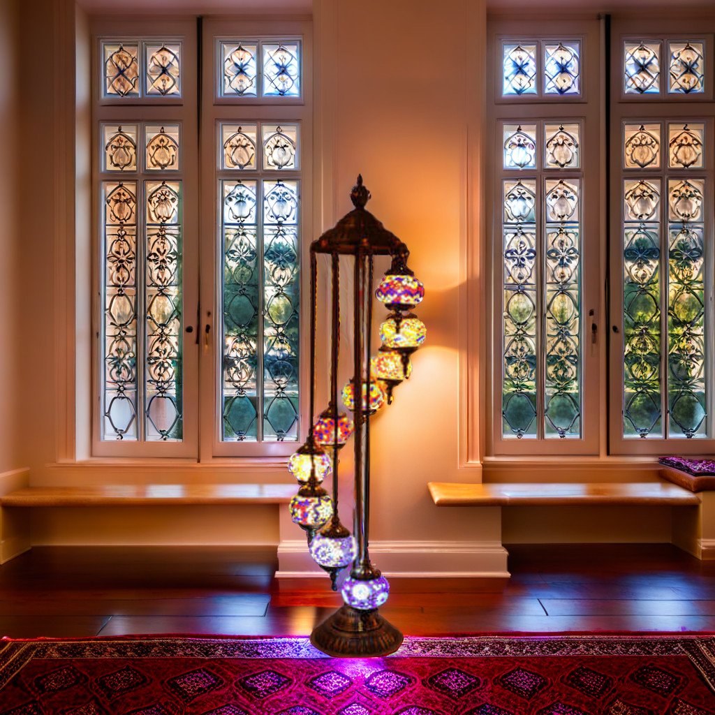 Beautify your entryway or any corner in your home with this elegant 9 Globe Floor Lamp (10″ Globes). These lamps have been handcrafted by skillful Turkish artisans and are 72″ tall and 14″ wide. Stunning patterns are created with hand-cut mosaic glass and beads on the globes. You can customize these floor lamps according to your preference by choosing all identical globes or create a unique look by mixing and matching the globes to create your own combination. All Floor Lamps require E12 base chandelier bulbs (Not inclusive, however, you have the option of adding 9 x 4 watt, 2700K, E12 base LED chandelier bulbs to your quote). These lamps are 110 V and are suitable for use in Canada and USA. They are inclusive of an on-off switch and can be plugged into a wall socket.