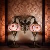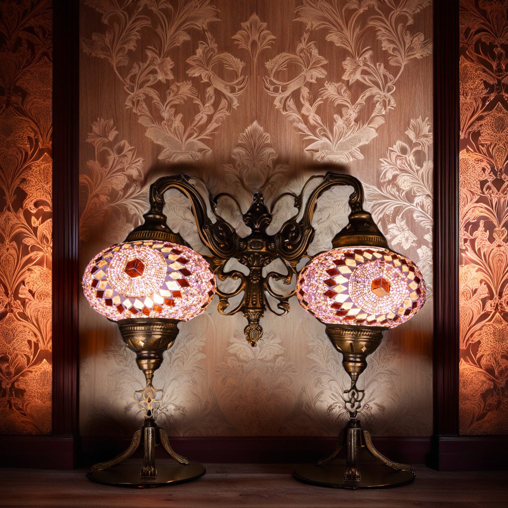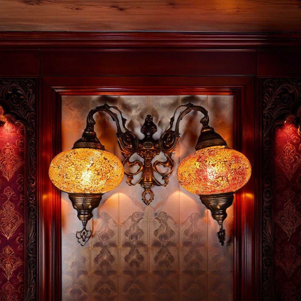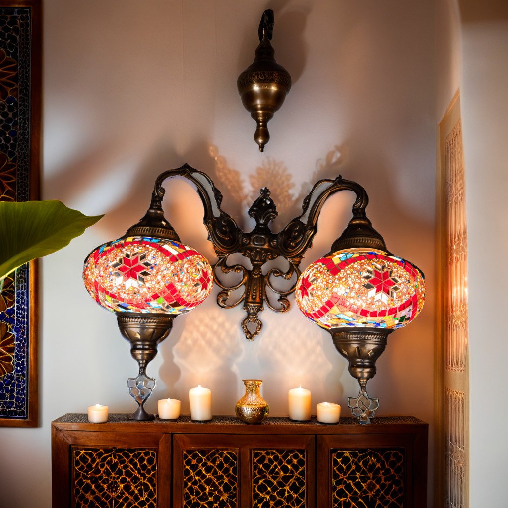 This double globe wall scone has an intricately designed brass base They are a one-of-a-kind stunning piece of art that you will crave for. The globes are made with hand cut pieces of high-quality glass and beads which are carefully placed together to produce attractive lamp patterns on a blown glass lamp shade. The vibrant color combinations are simply magical and perfect for home or office décor. Beautify any wall, the hallway or stairwell with a series of these stunning wall scones to create a unique look. These wall sconces are hand made by experienced Turkish artisans. They create a warm romantic ambiance and add charm and splendor to any room in your home or office. These sconces will need to be hardwired and secured into the wall with easily available metal or wood screws (Mounting hardware not included). They have E12 sockets and require 2 LED bulbs (not included,  however, you have the option of adding 2 x 4 watt, 2700K, E12 base LED chandelier bulbs to your quote).