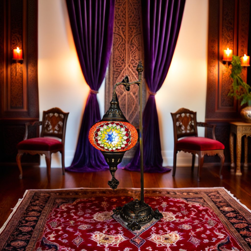 This variation of the traditional Brass base Turkish Swan lamp is inspired by the design of the original street light and adds interest to the décor. The globe does not dangle as in the traditional Swan lamps. They are made with hand cut pieces of high-quality glass and beads which are carefully placed together to produce stunning lamp patterns on a blown glass lamp shade. The vibrant color combinations are simply magical and perfect for home or office décor, gifting for weddings, anniversaries, housewarming parties, Mother’s Day and as festive and corporate gifts. These Lamp Post style lamps are hand made by experienced Turkish artisans. They create a warm romantic ambiance and add charm and splendor to any room in your home or office. They are 110V and suitable for use in USA and Canada. These lamps are ready to plug in and have an on/off switch. They have an E12 socket and requires 1 LED bulb. (Not included, however, you have the option of adding 1 x 4 watt, 2700K, E12 base LED chandelier bulb to your quote).