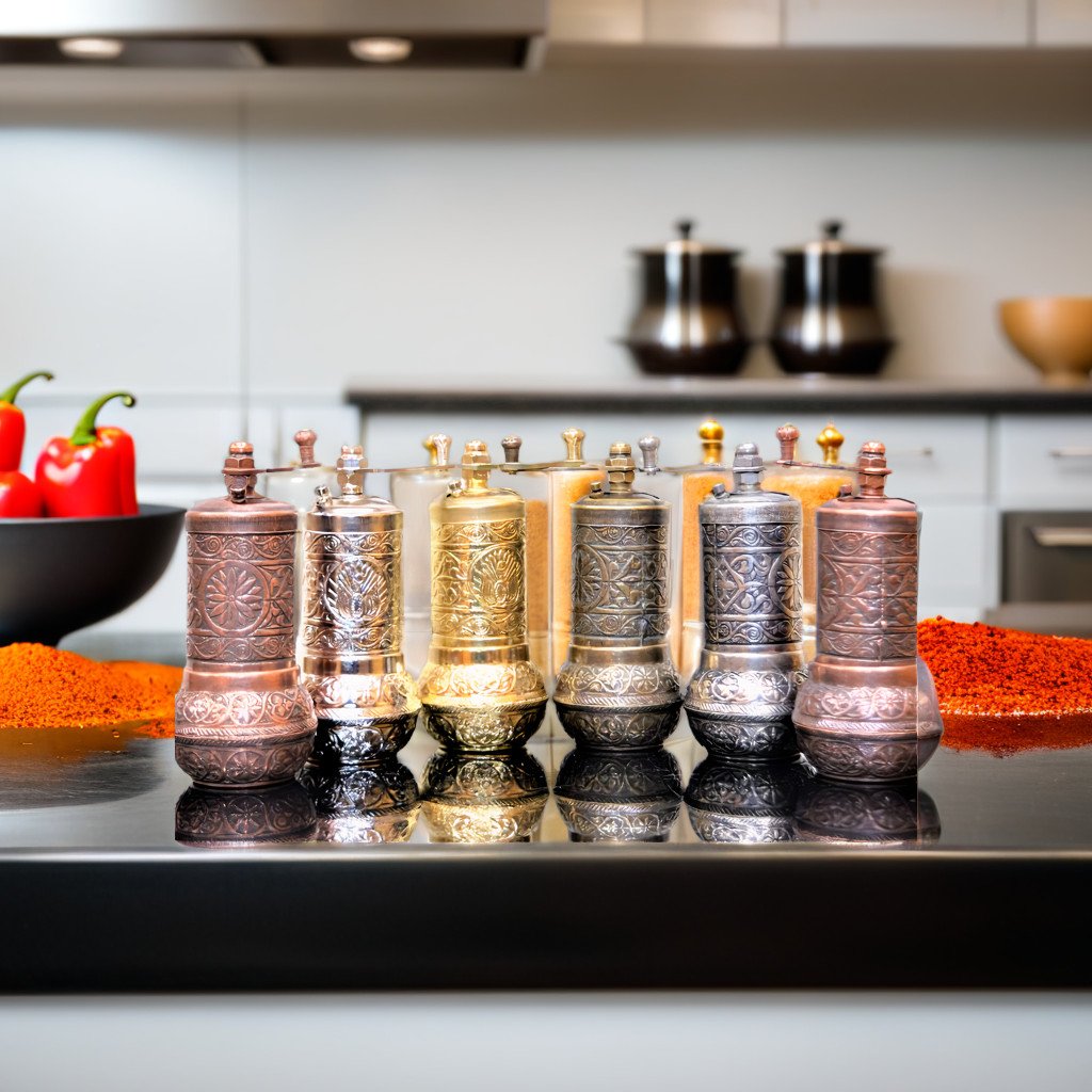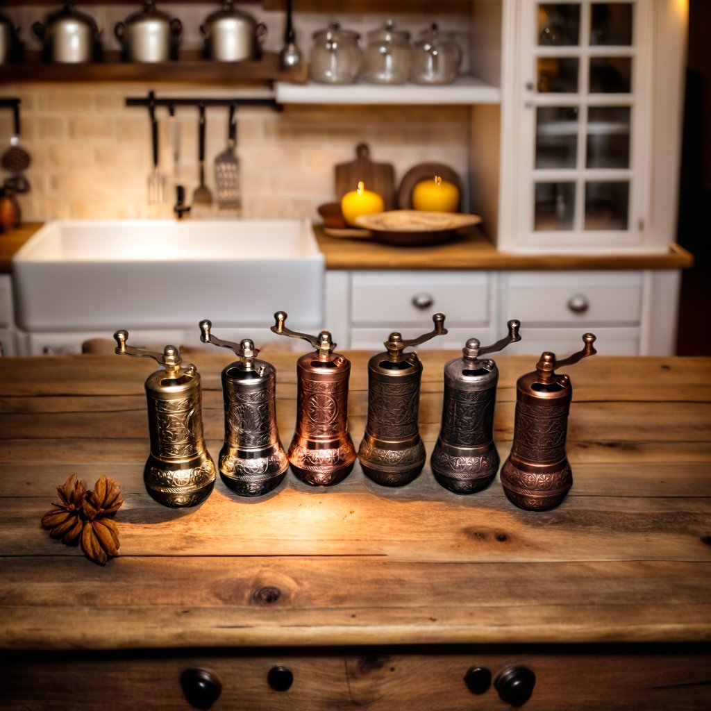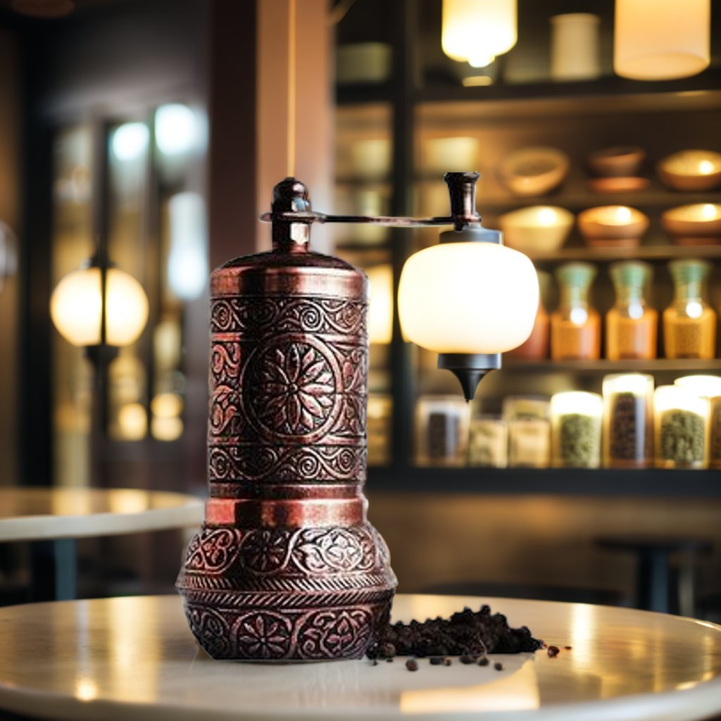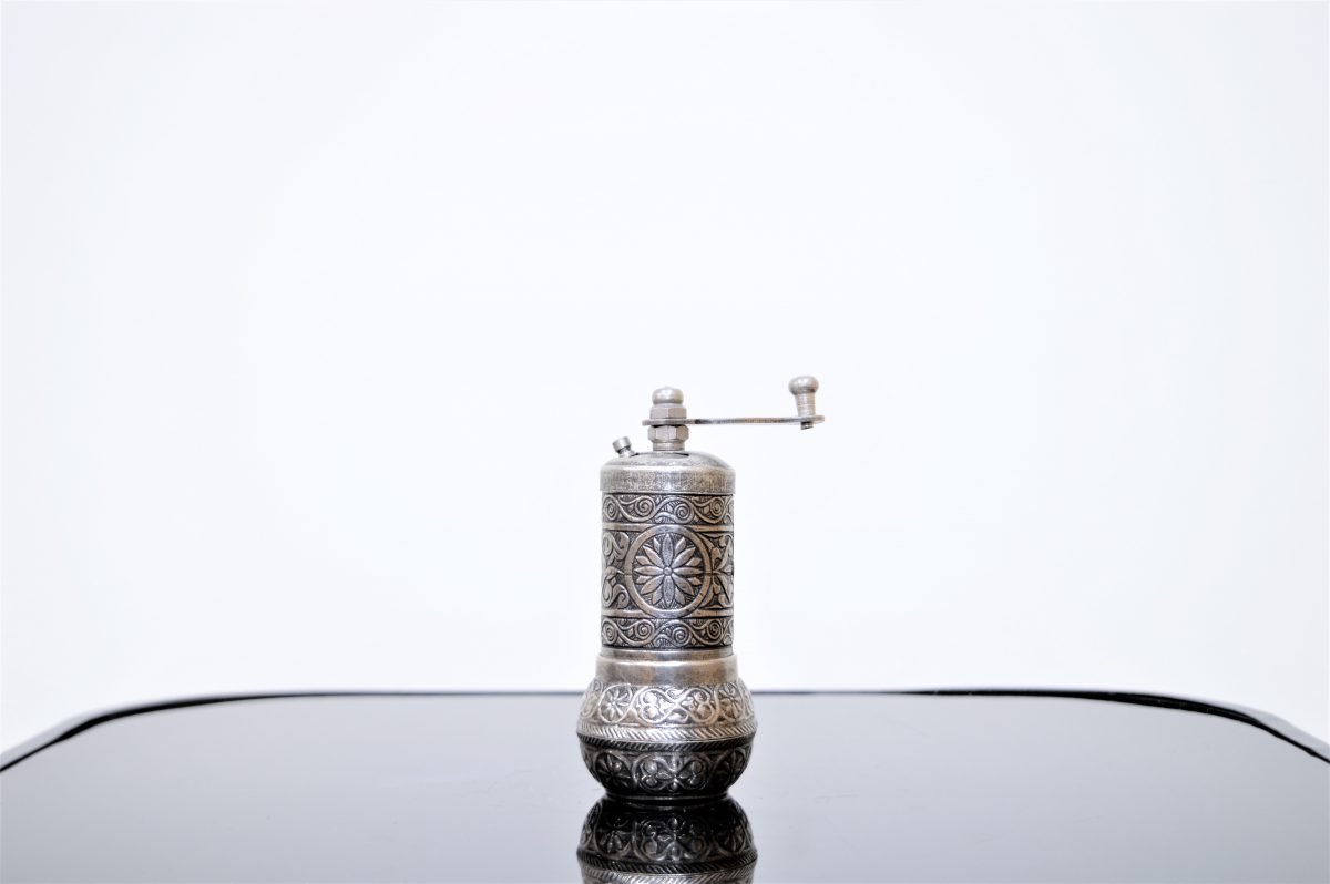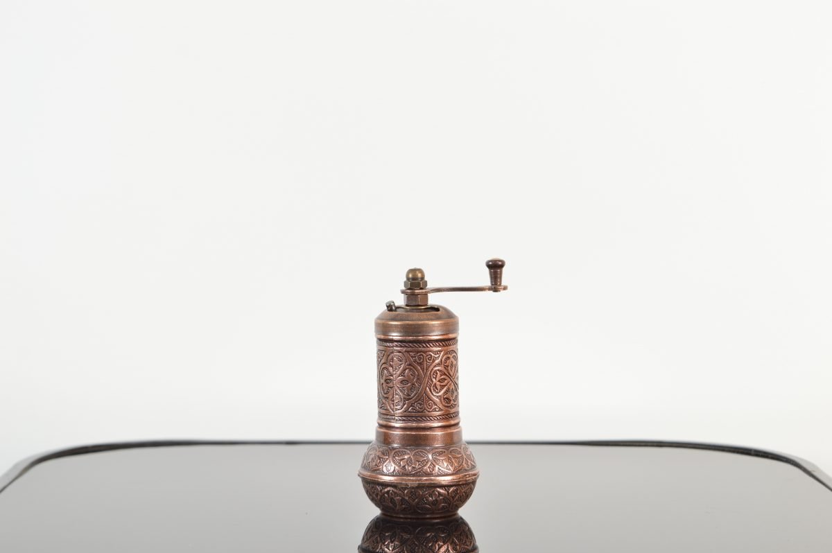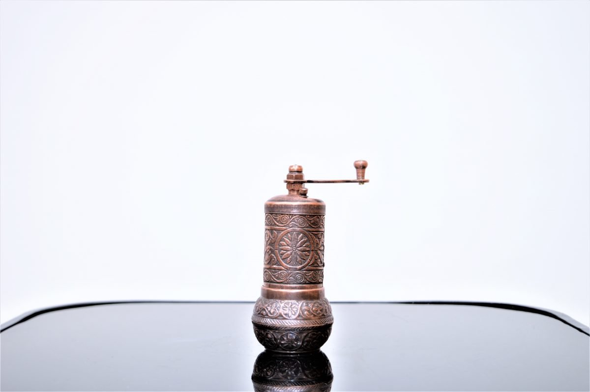 Enhance the beauty of your dining table or kitchen counter with this metal Turkish pepper grinder. This hand carved pepper grinder is modern but retains a vintage charm, and is available in several finishes including antique brass, silver, and copper as well as shiny gold, silver and copper. The grinder bell housing within the grinder body contains teeth that efficiently crush peppercorns to a powder form. A perfect kitchen gadget and a unique gift for your loved ones.