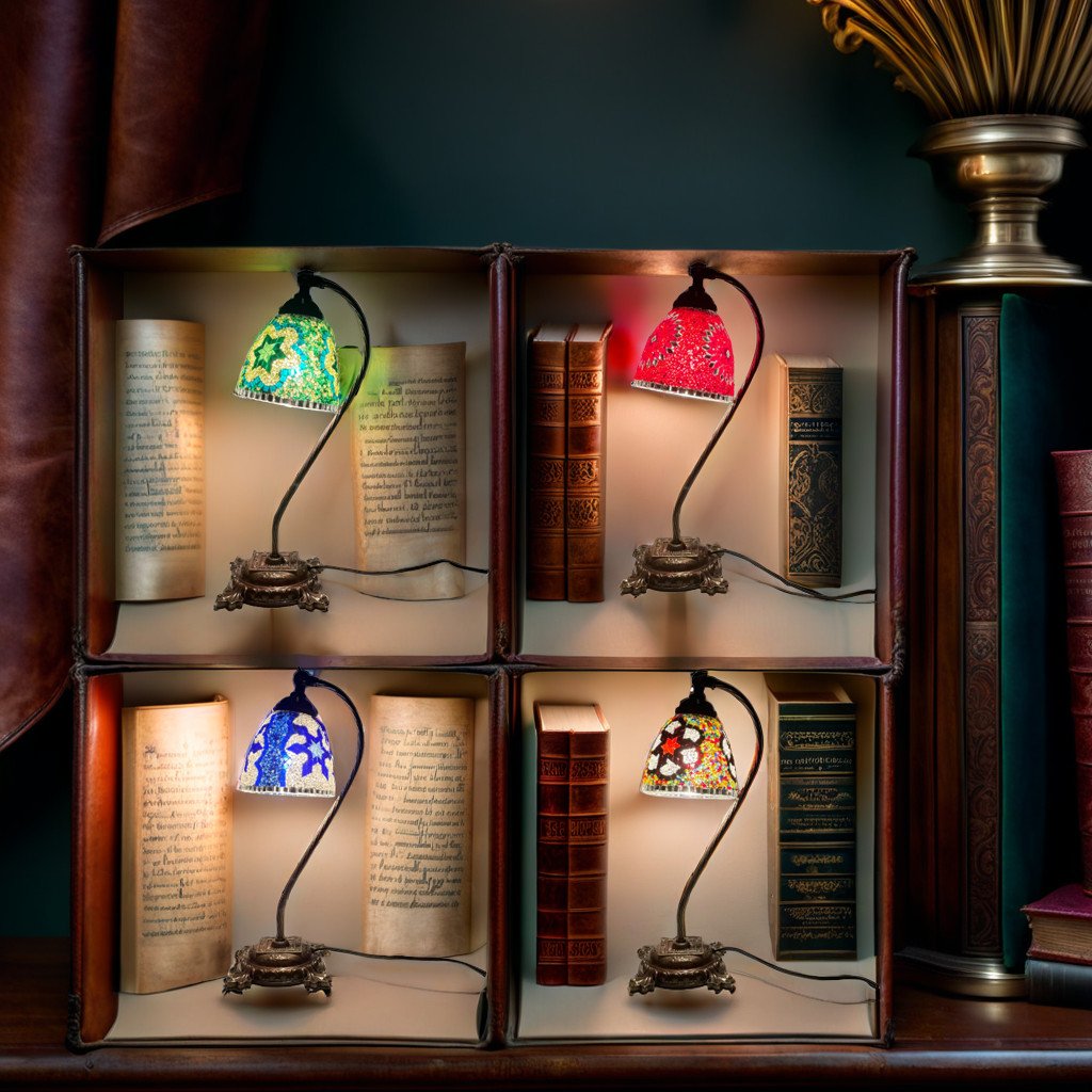 These Reading Lamps are made by skillful Turkish artisans, using hand cut pieces of high-quality glass and beads which are carefully placed together to produce stunning lamp patterns on a blown glass lamp shade. The vibrant color combinations are simply magical and perfect for home or office décor, gifting for weddings, anniversaries, house-warming parties, Mother’s Day and as festive and corporate gifts. They create a warm romantic ambiance and add charm and splendor to your bedside tables in your home or on any desk in your office or library. They are 110V and suitable for use in USA and Canada. These lamps are ready to plug in and have an on/off switch. The metal base has a knob that helps you adjust the angle of the glass shade for perfect reading light. They have an E12 socket and requires 1 LED bulb. (Not included, however, you have the option of adding 1 x 4 watt, 2700K, E12 base LED chandelier bulb to your quote).
