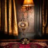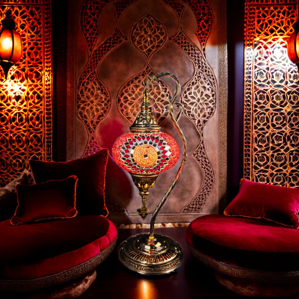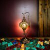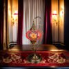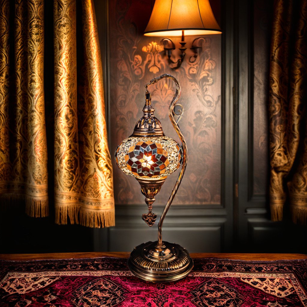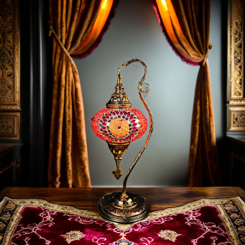 This variation of the traditional Brass base Turkish Swan lamp has a Golden base to add a hint of richness to the décor. They are made with hand cut pieces of high-quality glass and beads which are carefully placed together to produce stunning lamp patterns on a blown glass lamp shade. The vibrant color combinations are simply magical and perfect for home or office décor, gifting for weddings, anniversaries, housewarming parties, Mother’s Day and as festive and corporate gifts. The Gold base Swan lamps are hand made by experienced Turkish artisans. They create a warm romantic ambiance and add charm and splendor to any room in your home or office. They are 110V and suitable for use in USA and Canada. These lamps are ready to plug in and have an on/off switch. They have an E12 socket and requires 1 LED bulb. (Not included however, you have the option of adding 1 x 4 watt, 2700K, E12 base LED chandelier bulb to your quote).