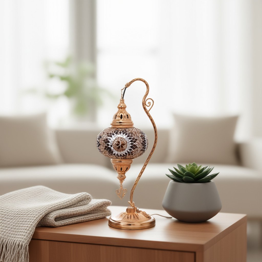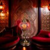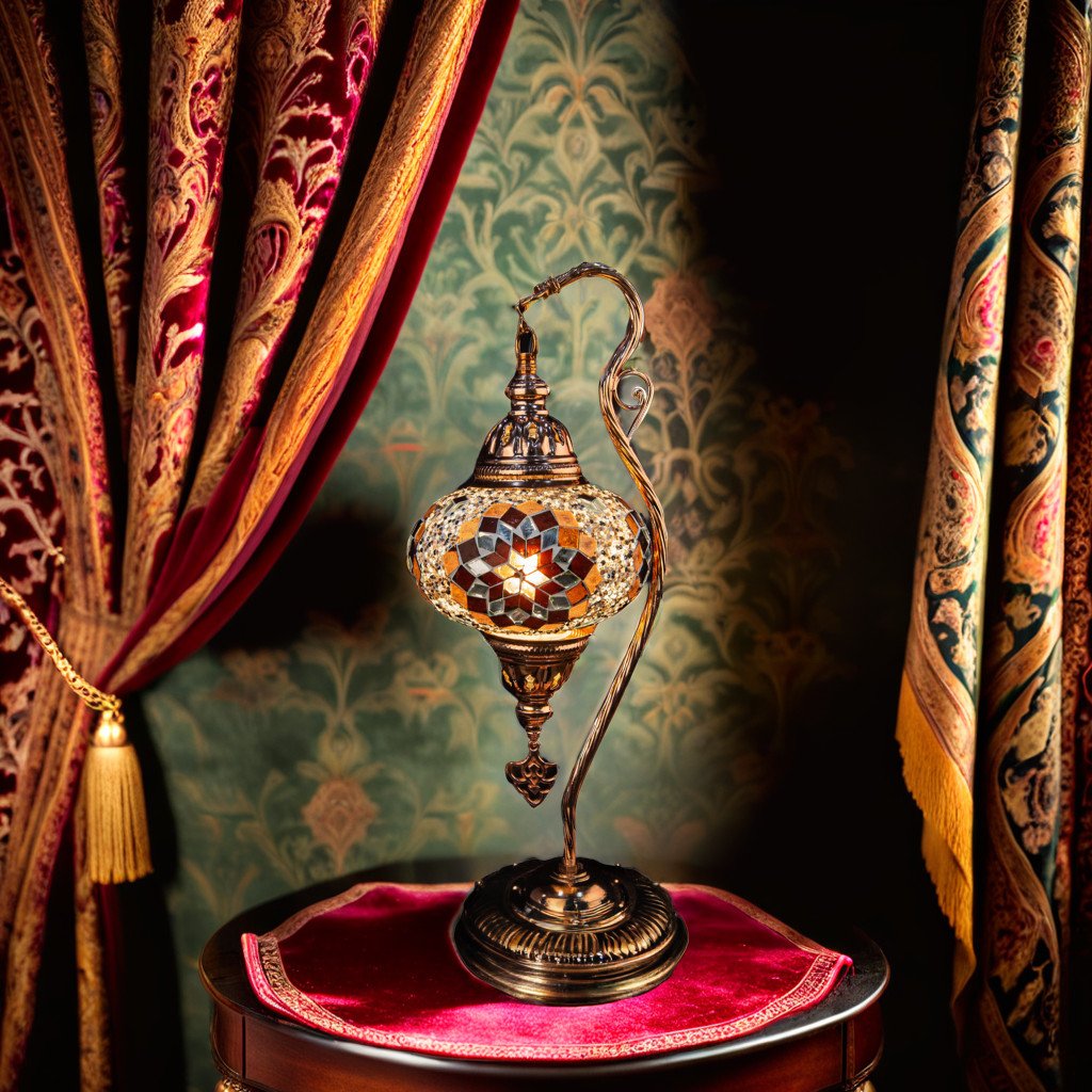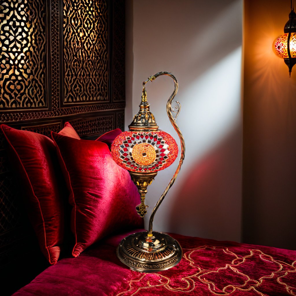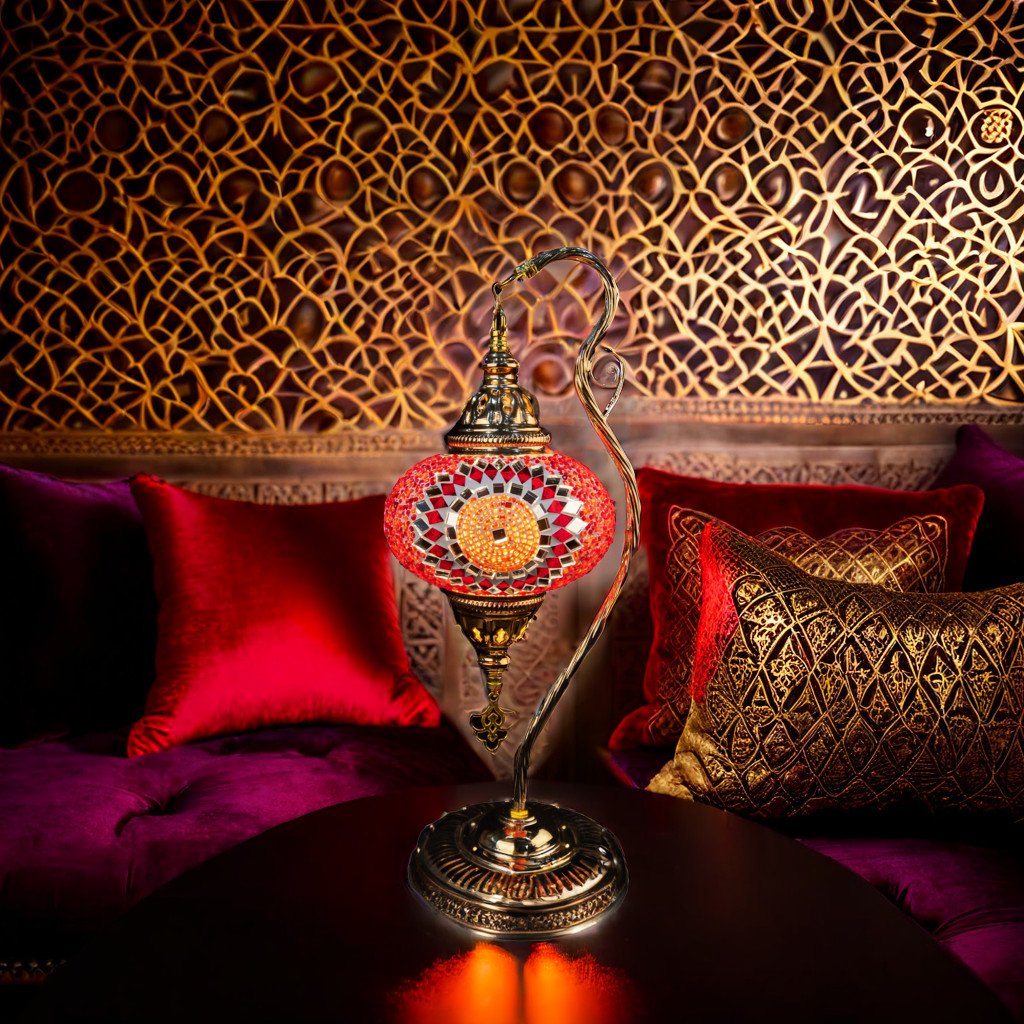 This variation of the traditional Brass base Turkish Swan lamp has a Golden base to add a hint of richness to the décor. They are made with hand cut pieces of high-quality glass and beads which are carefully placed together to produce stunning lamp patterns on a blown glass lamp shade. The vibrant color combinations are simply magical and perfect for home or office décor, gifting for weddings, anniversaries, housewarming parties, Mother’s Day and as festive and corporate gifts. The Gold base Swan lamps are hand made by experienced Turkish artisans. They create a warm romantic ambiance and add charm and splendor to any room in your home or office. They are 110V and suitable for use in USA and Canada. These lamps are ready to plug in and have an on/off switch. They have an E12 socket and requires 1 LED bulb. (Not included however, you have the option of adding 1 x 4 watt, 2700K, E12 base LED chandelier bulb to your quote).