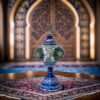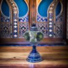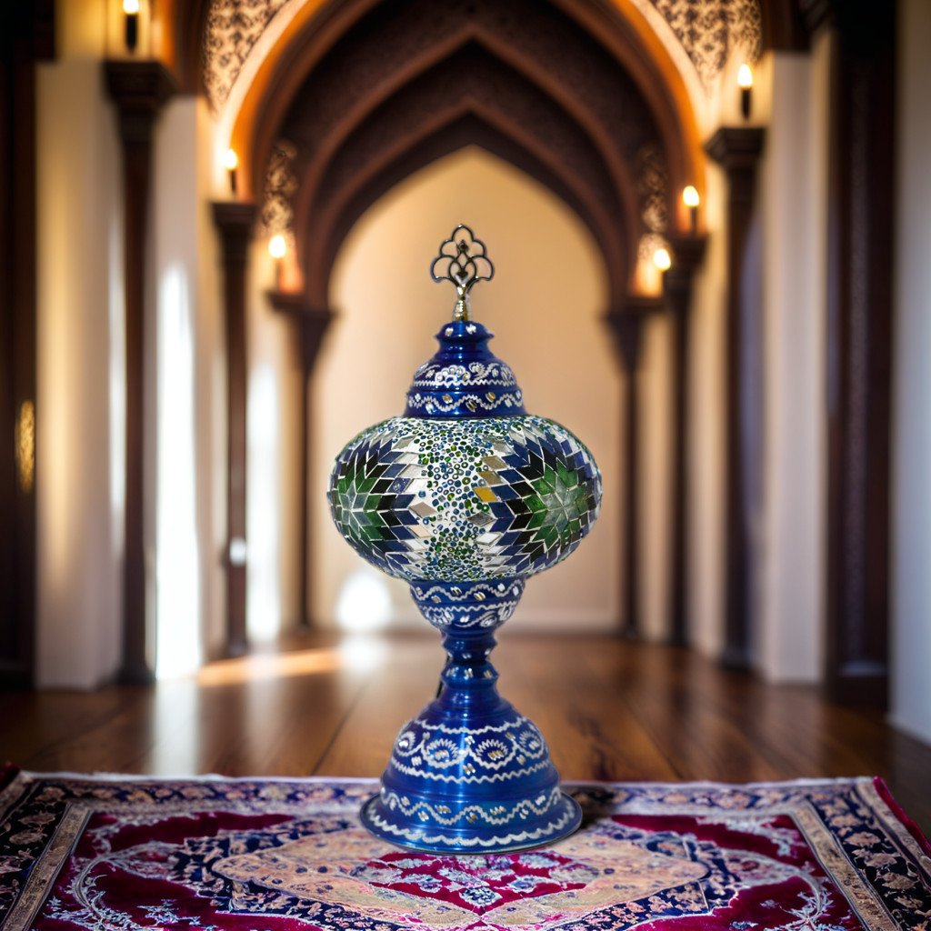 These Turkish Table Lamps have an electric blue metallic base with designs intricately etched in silver. The Globes are adorned with hand cut pieces of high-quality glass and beads which are carefully placed together to produce stunning lamp patterns on a blown glass lamp shade. The vibrant color combinations are simply magical and perfect for home or office décor, gifting for weddings, anniversaries, housewarming parties, Mother’s Day and as festive and corporate gifts. The Tower lamps are hand made by experienced Turkish artisans. They create a warm romantic ambiance and add charm and splendor to any room in your home or office. They are 110V and suitable for use in USA and Canada. These lamps are ready to plug in and have an on/off switch. They have an E 12 socket and requires 1 E12 base LED bulb. (Not included, however, you have the option of adding 1 x 4 watt, 2700K, E12 base LED chandelier bulb to your quote).